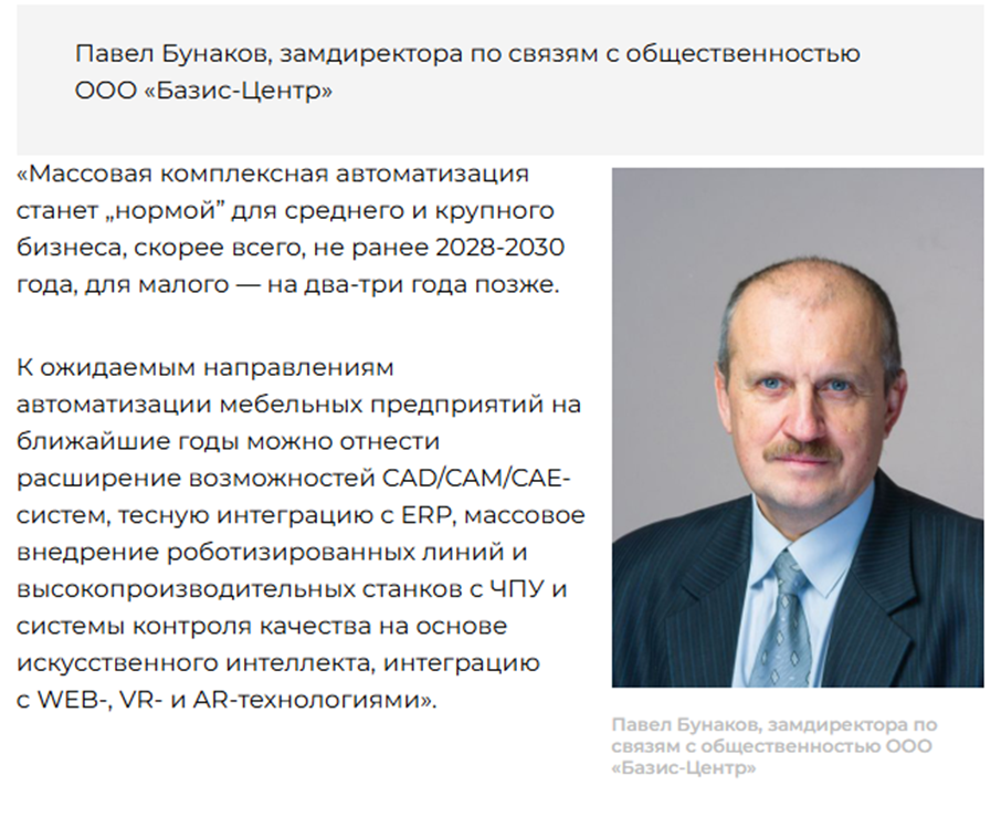 Тем не менее конкуренция и кадровый голод неизбежно будут подталкивать мебельщиков к повышению уровня автоматизации. Опыт нашей компании показывает, что их ни в коем случае нельзя считать консерваторами», — выразил уверенность замдиректора по связям с общественностью ООО «Базис-Центр» Павел Бунаков.
